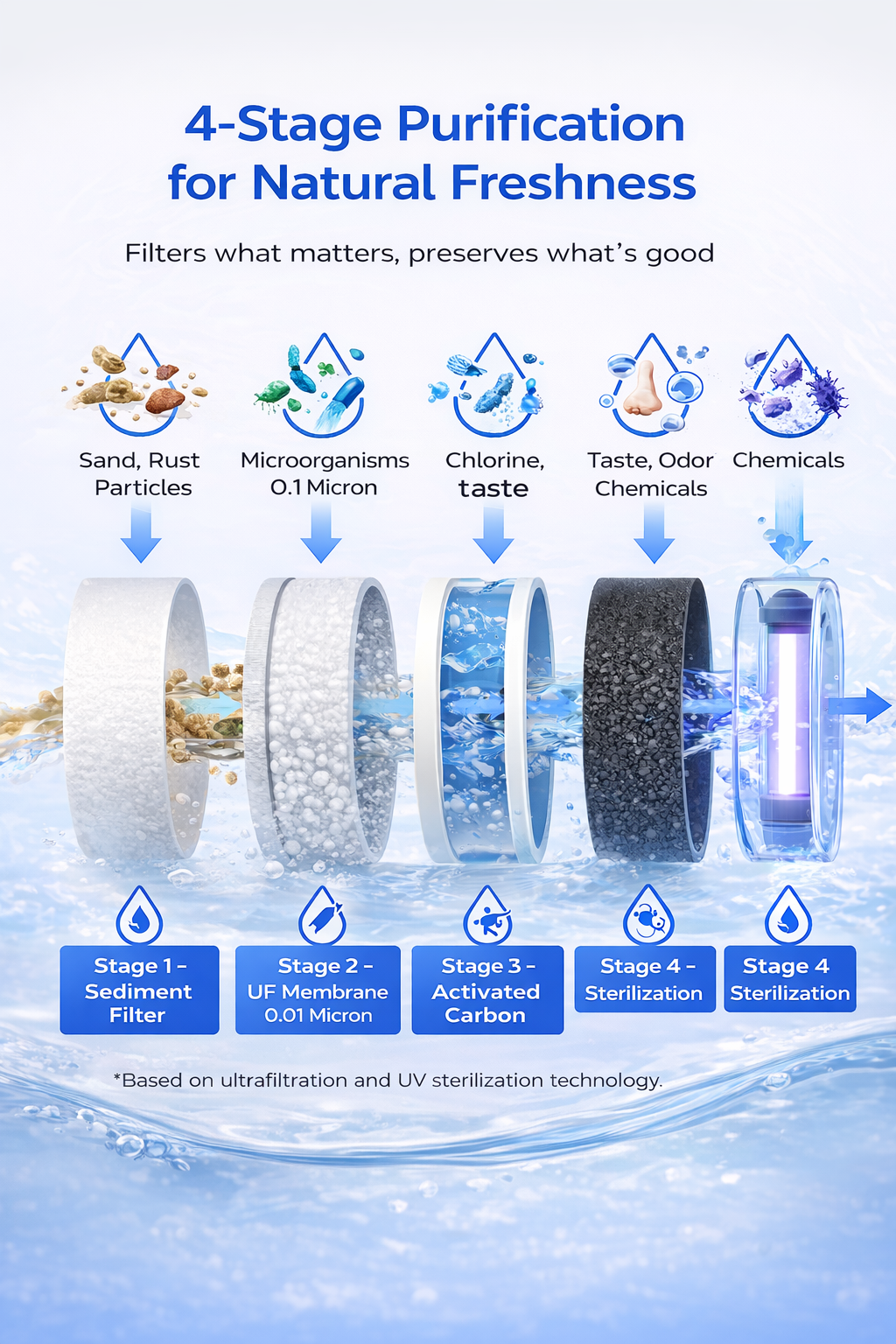 Four-stage dual filtration removes bacteria, viruses, chlorine, heavy metals, and more - for water that’s fresh, clean, and safe